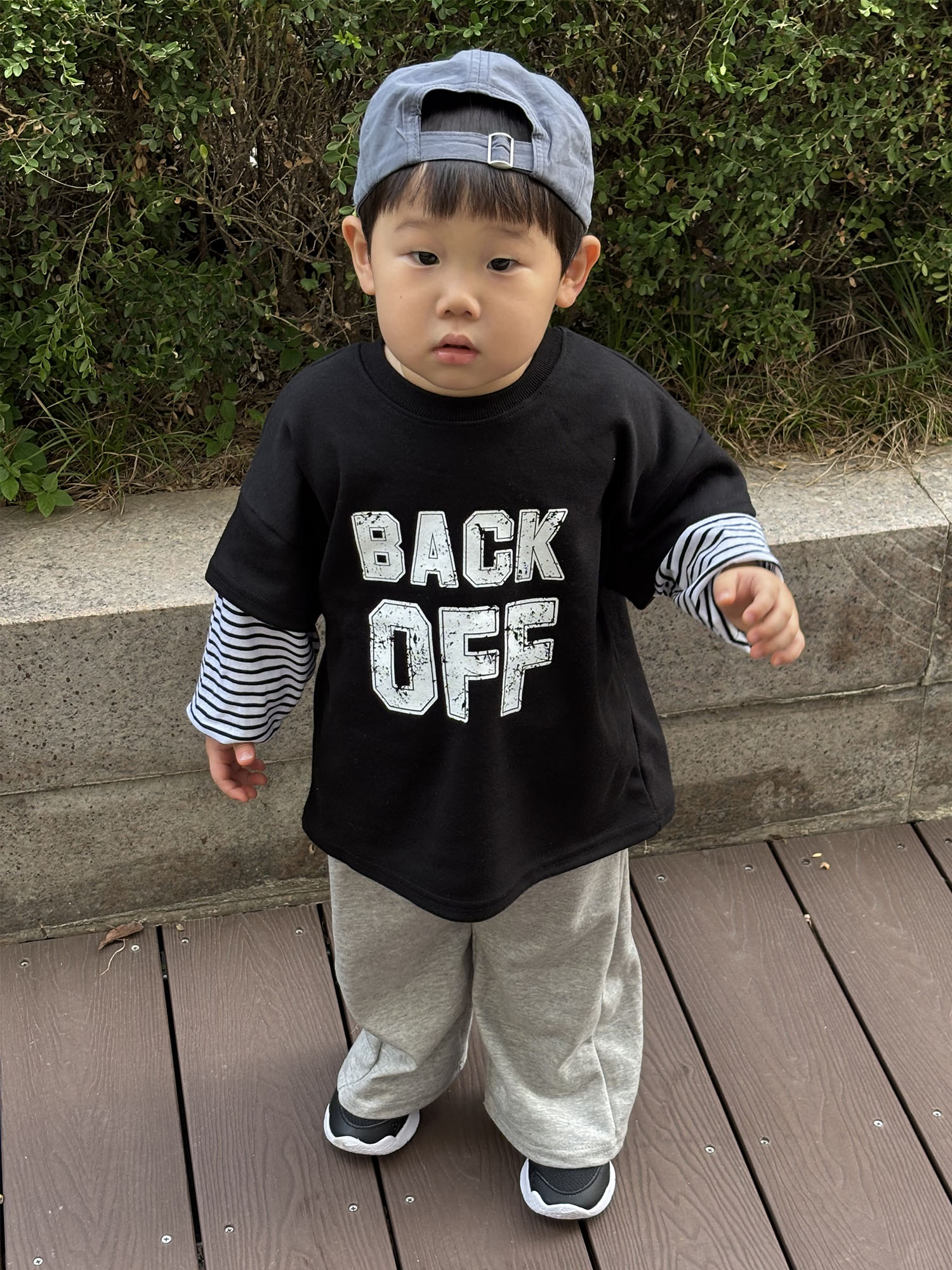 프론트에 “BACK OFF” 빈티지한 그래픽 프린팅이 귀엽게 포인트가 되어줘요.