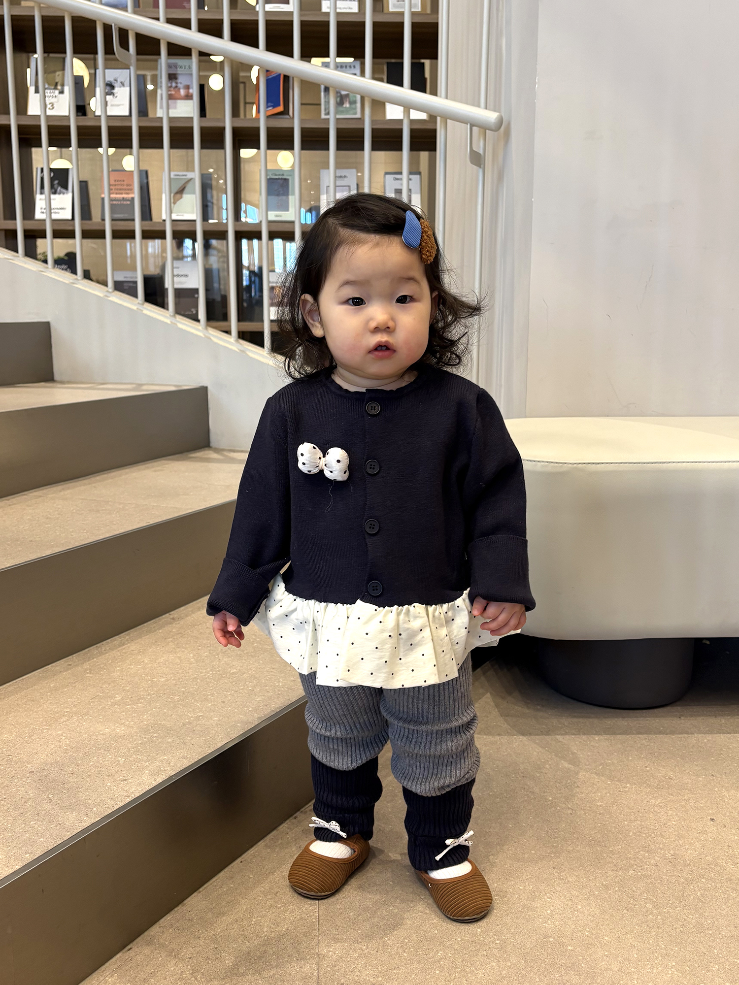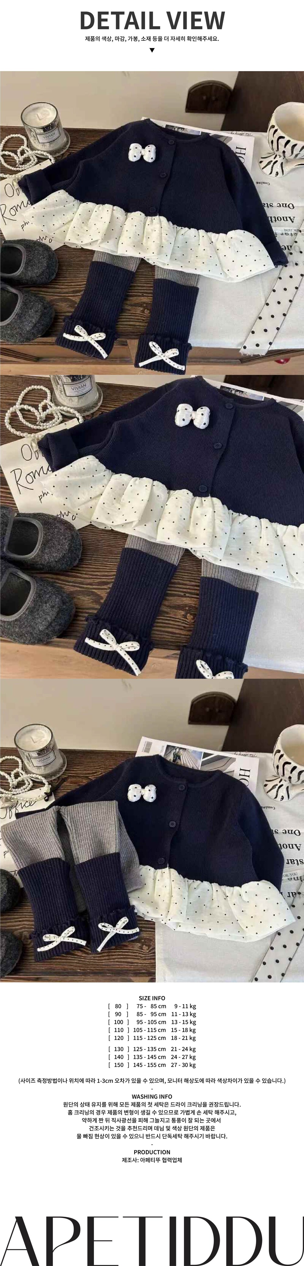 가디건은 깔끔한 라운드넥 디자인에 밑단에 도트 패턴 프릴이