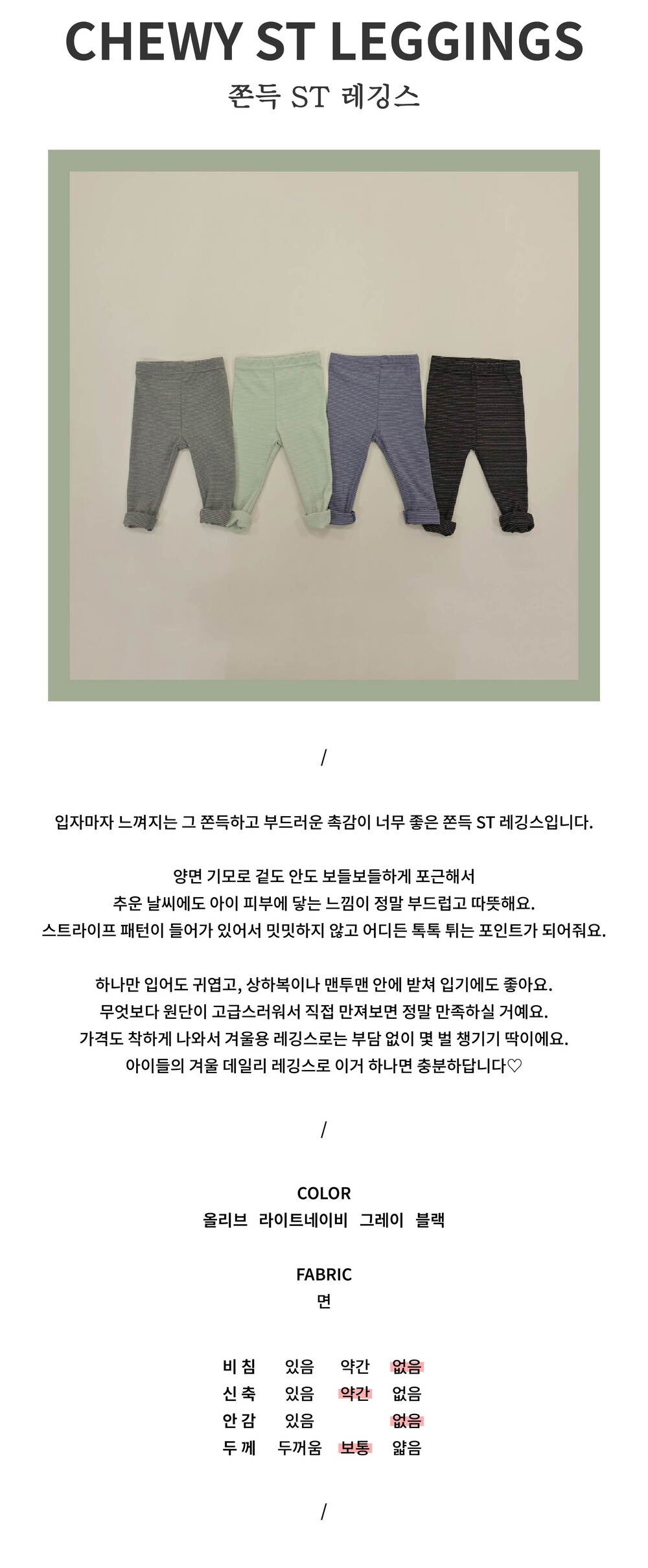 입자마자 느껴지는 그 쫀득하고 부드러운 촉감이 너무 좋은 쫀득 ST 레깅스입니다.
