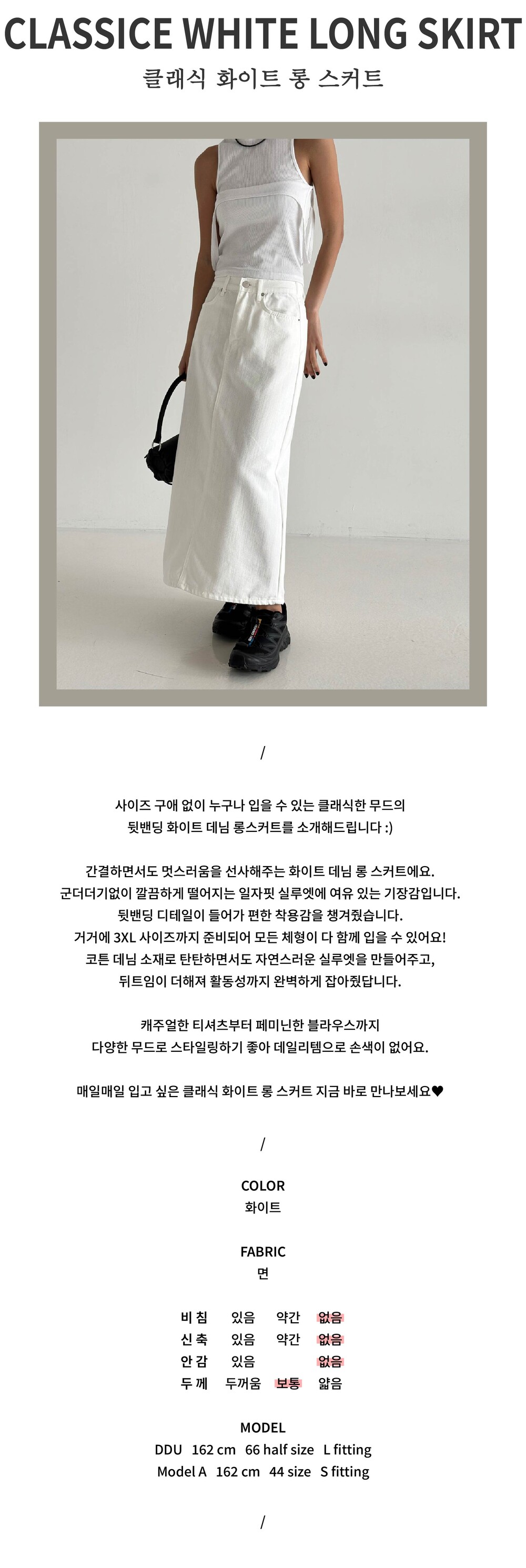 간결하면서도 멋스러움을 선사해주는 화이트 데님 롱 스커트에요.
