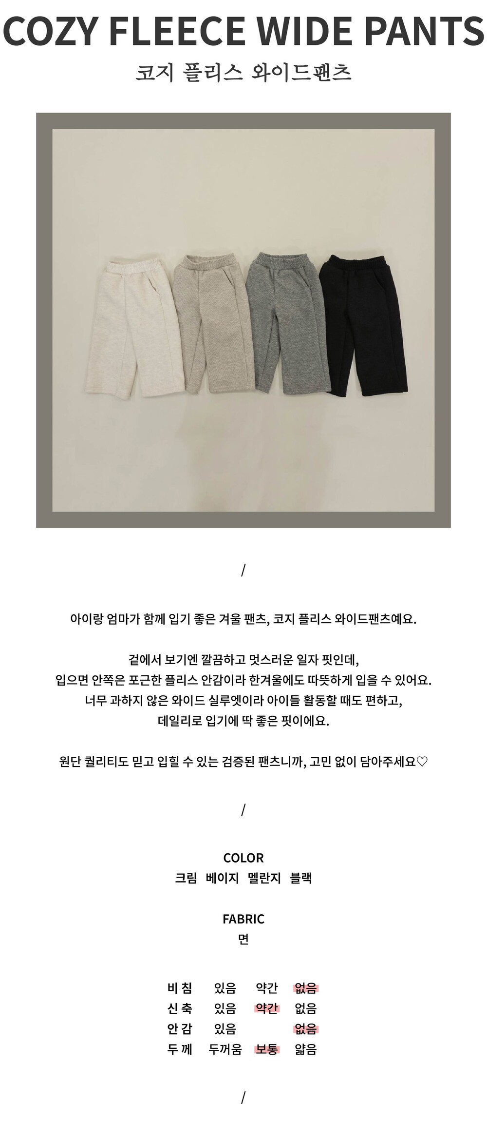 아이랑 엄마가 함께 입기 좋은 겨울 팬츠, 코지 플리스 와이드팬츠예요.