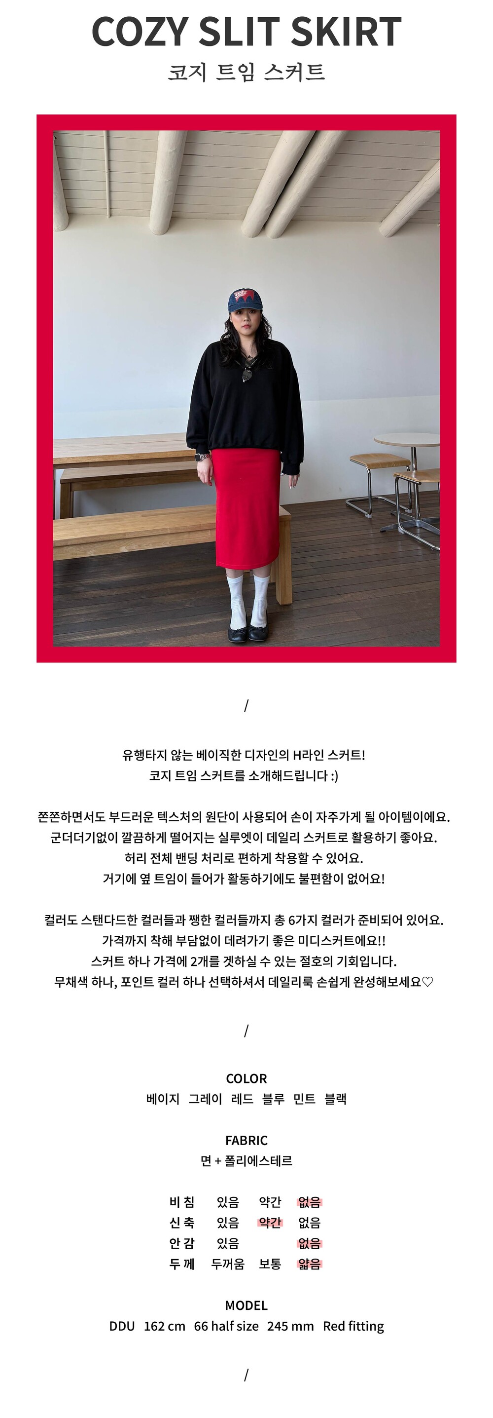 군더더기없이 깔끔하게 떨어지는 실루엣이 데일리 스커트로 활용하기 좋아요.