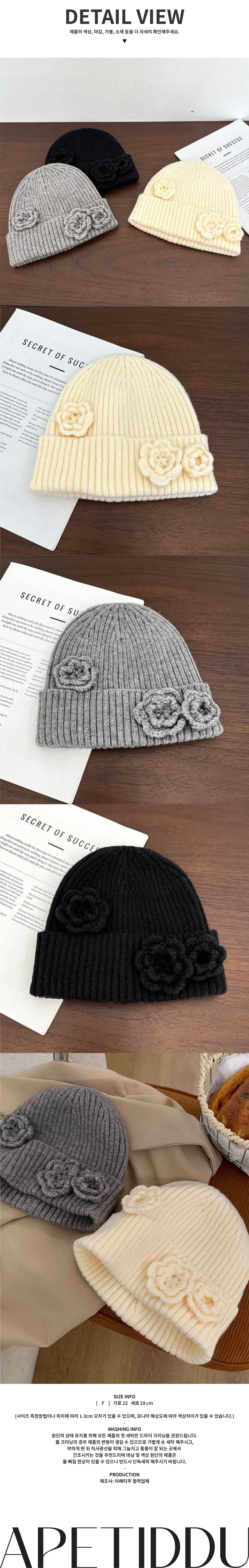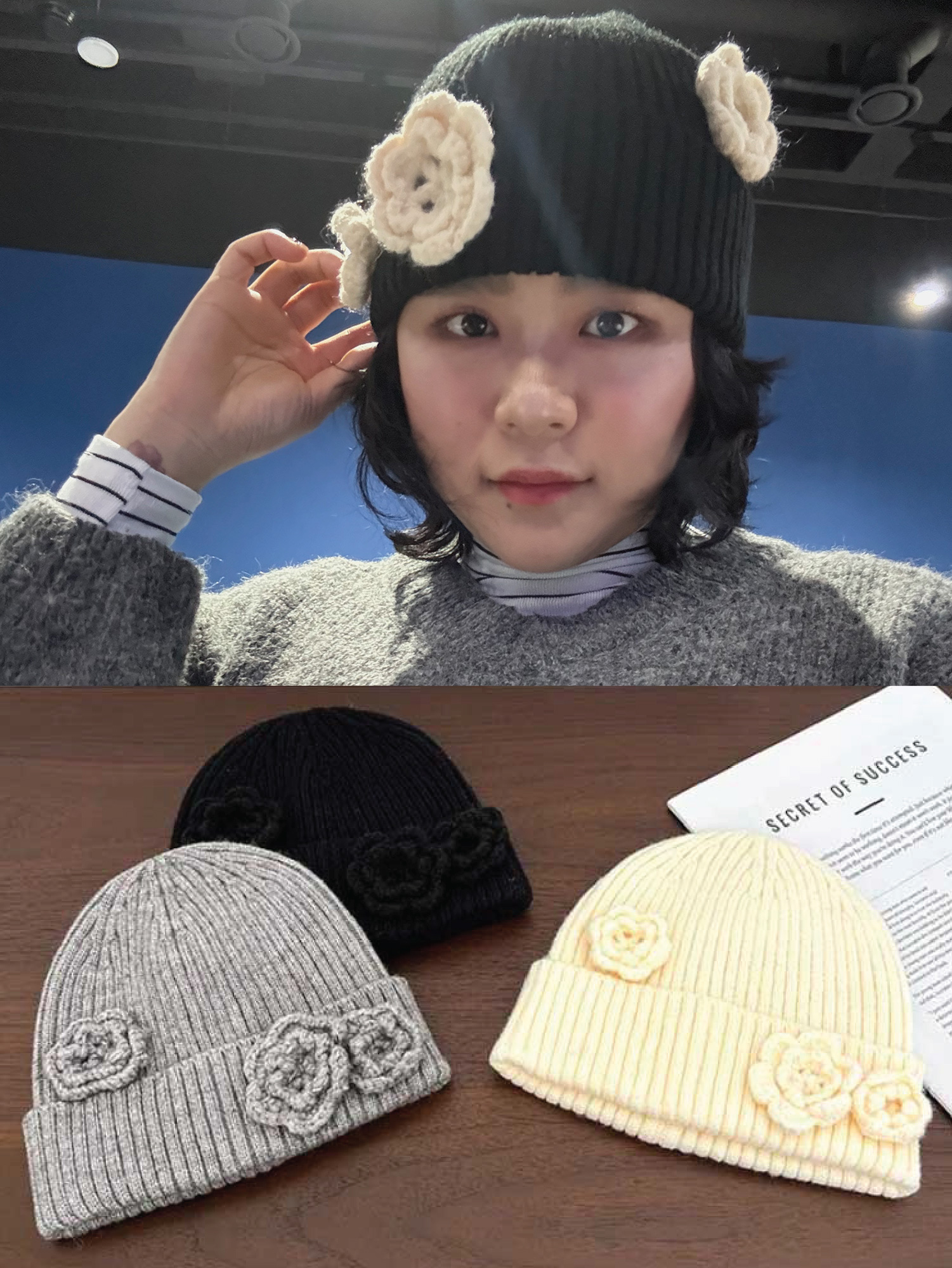 심플한 니트 비니에 입체적인 플라워 디테일이 더해져