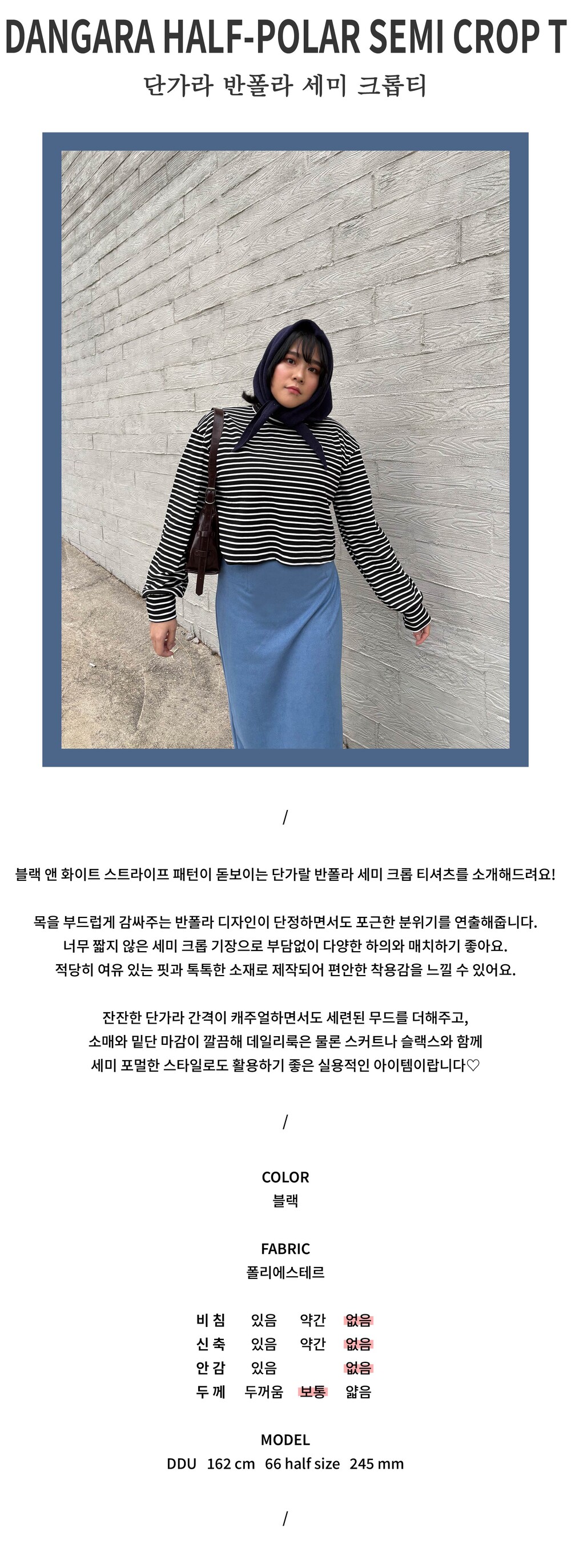 너무 짧지 않은 세미 크롭 기장으로 부담없이 다양한 하의와 매치하기 좋아요.
