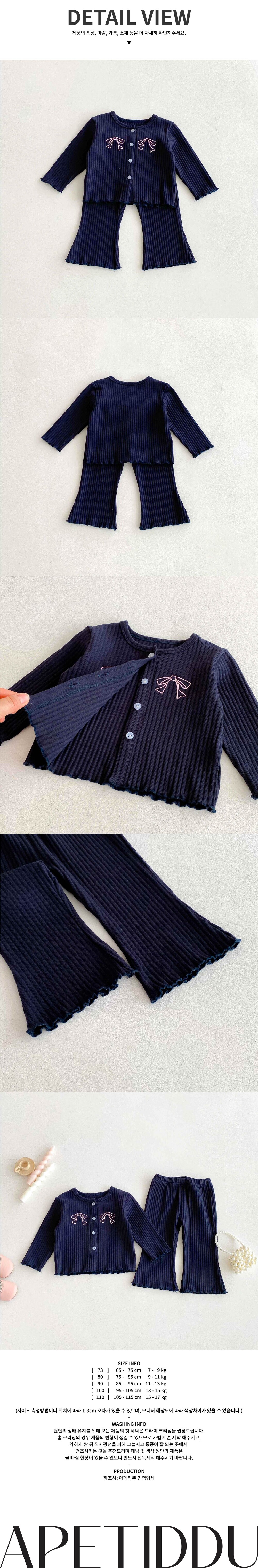 상의는 귀여운 리본 자수 디테일과 단추 포인트로 사랑스러움을 더해준 가디건 스타일이에요.