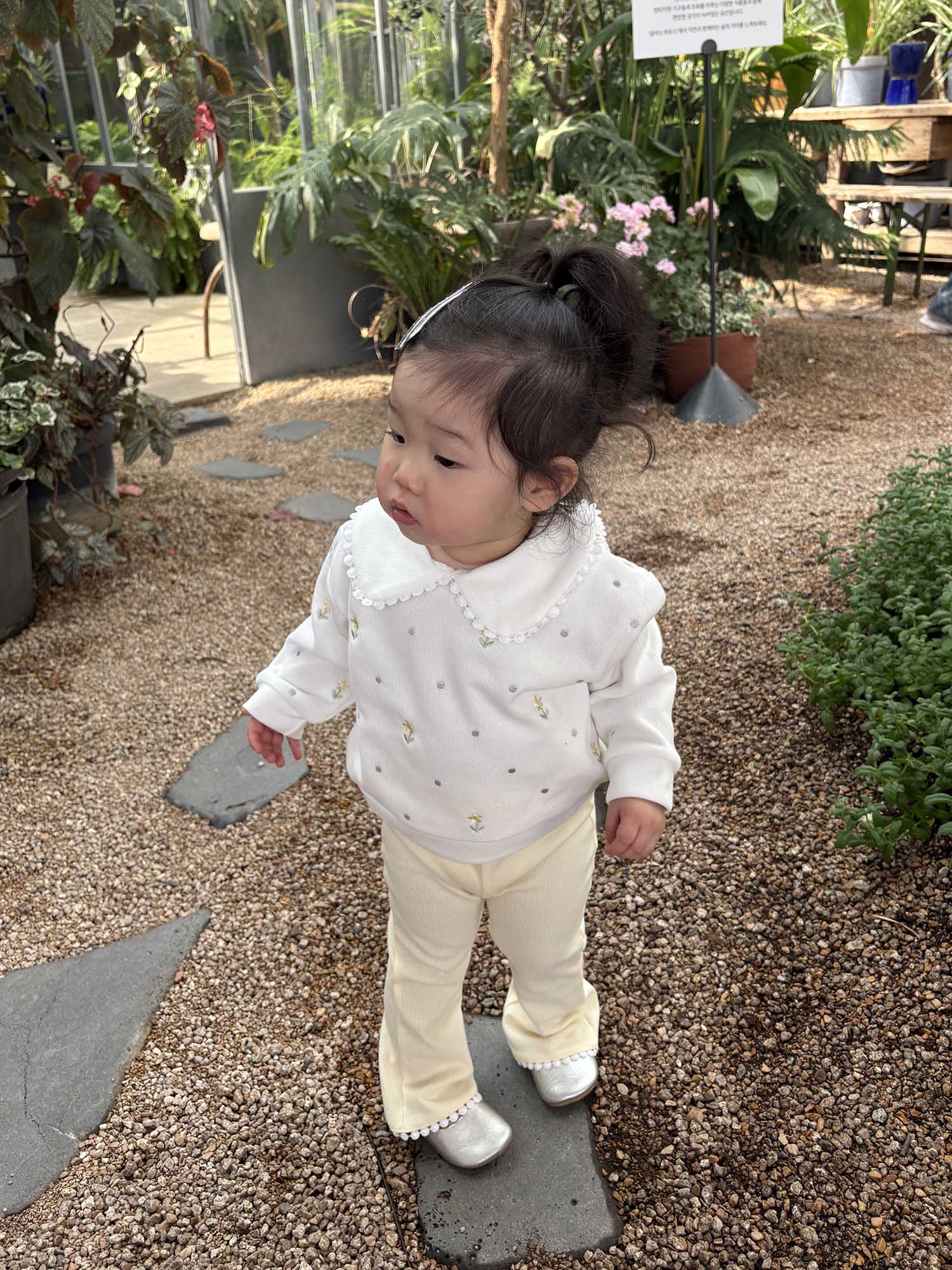환한 아이보리 컬러의 플라워 자수가 은은하게 들어간 상의와