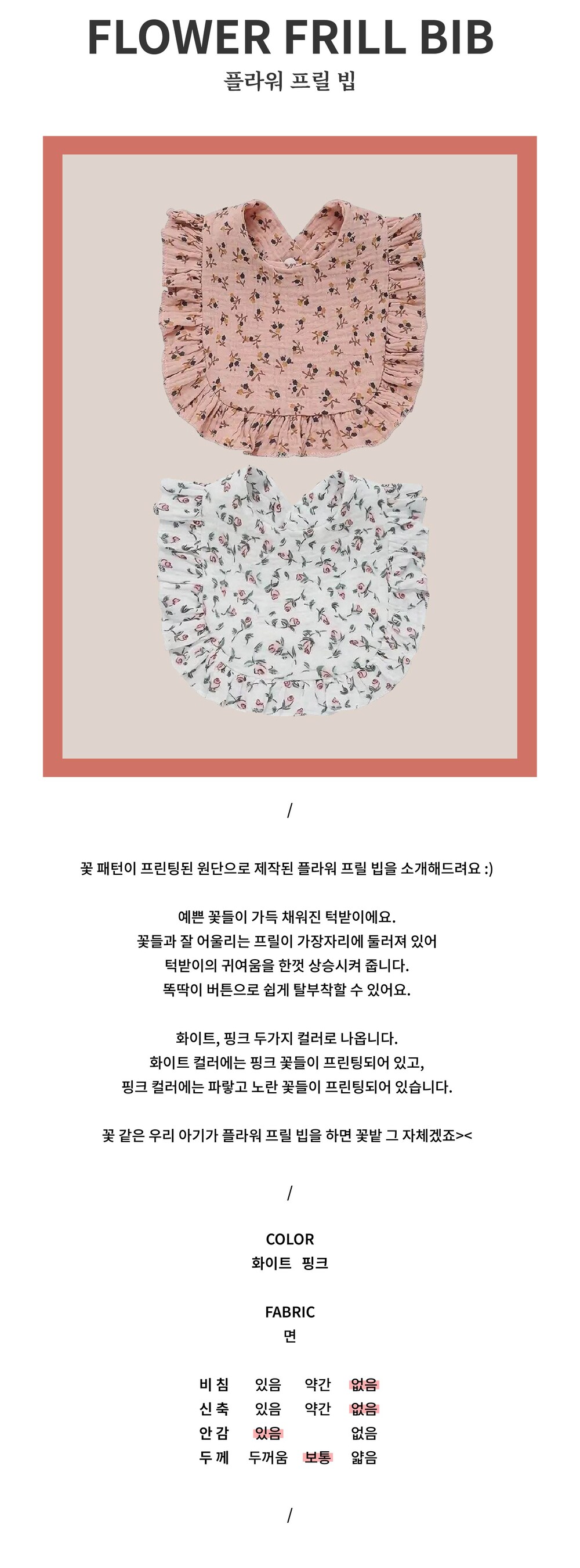 꽃 패턴이 프린팅된 원단으로 제작된 플라워 프릴 빕을 소개해드려요 :)