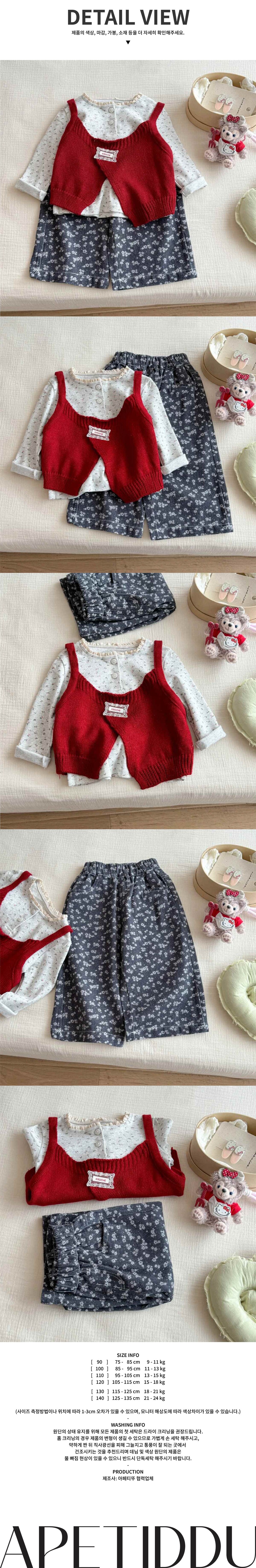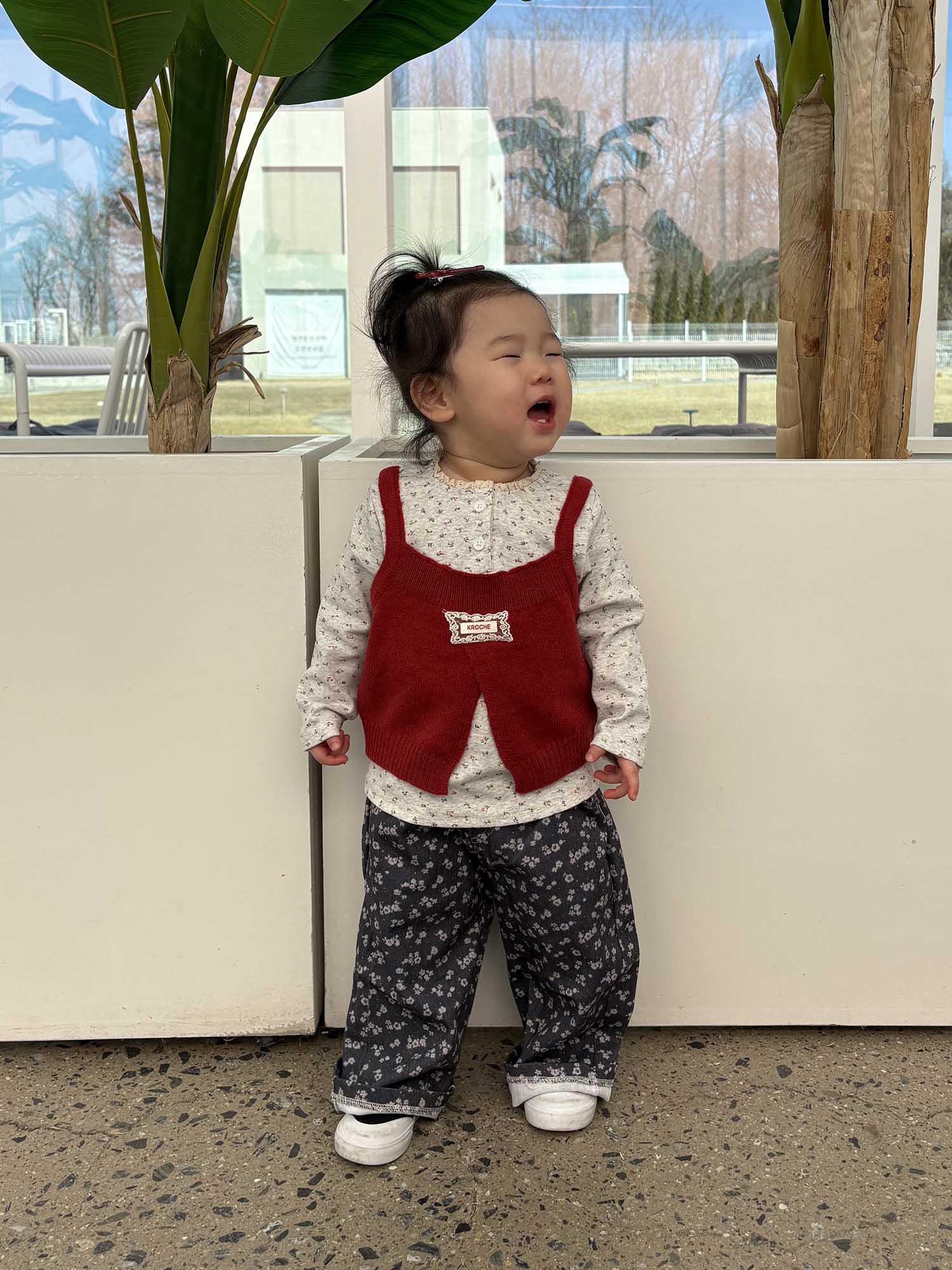 잔꽃 패턴이 은근하게 들어간 부드러운 티셔츠 위에 빨간 니트 뷔스티에를 레이어드해줬어요.