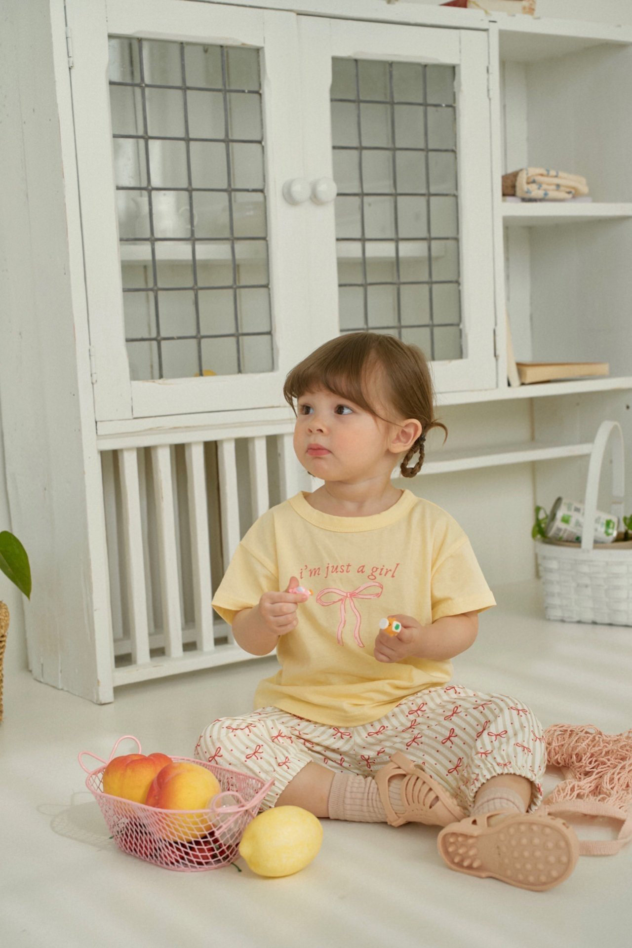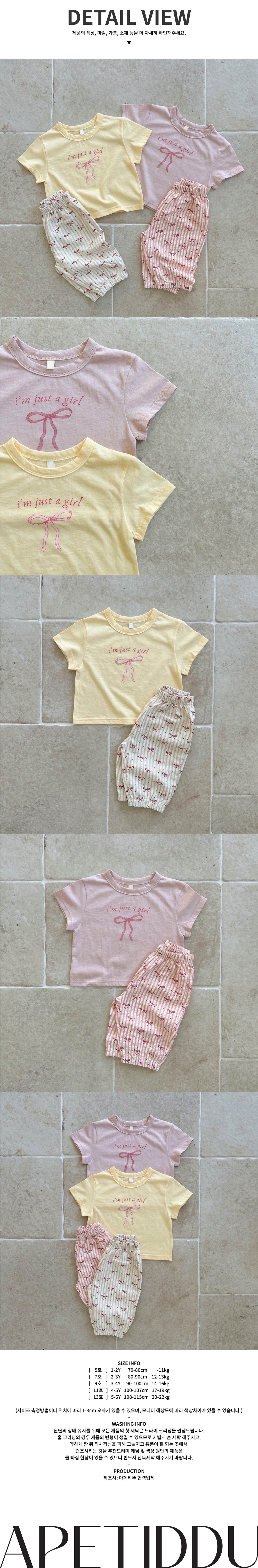 티셔츠 중앙에는 큰 리본이, 팬츠에는 전체적으로 리본이 패턴으로 프린팅되었습니다.