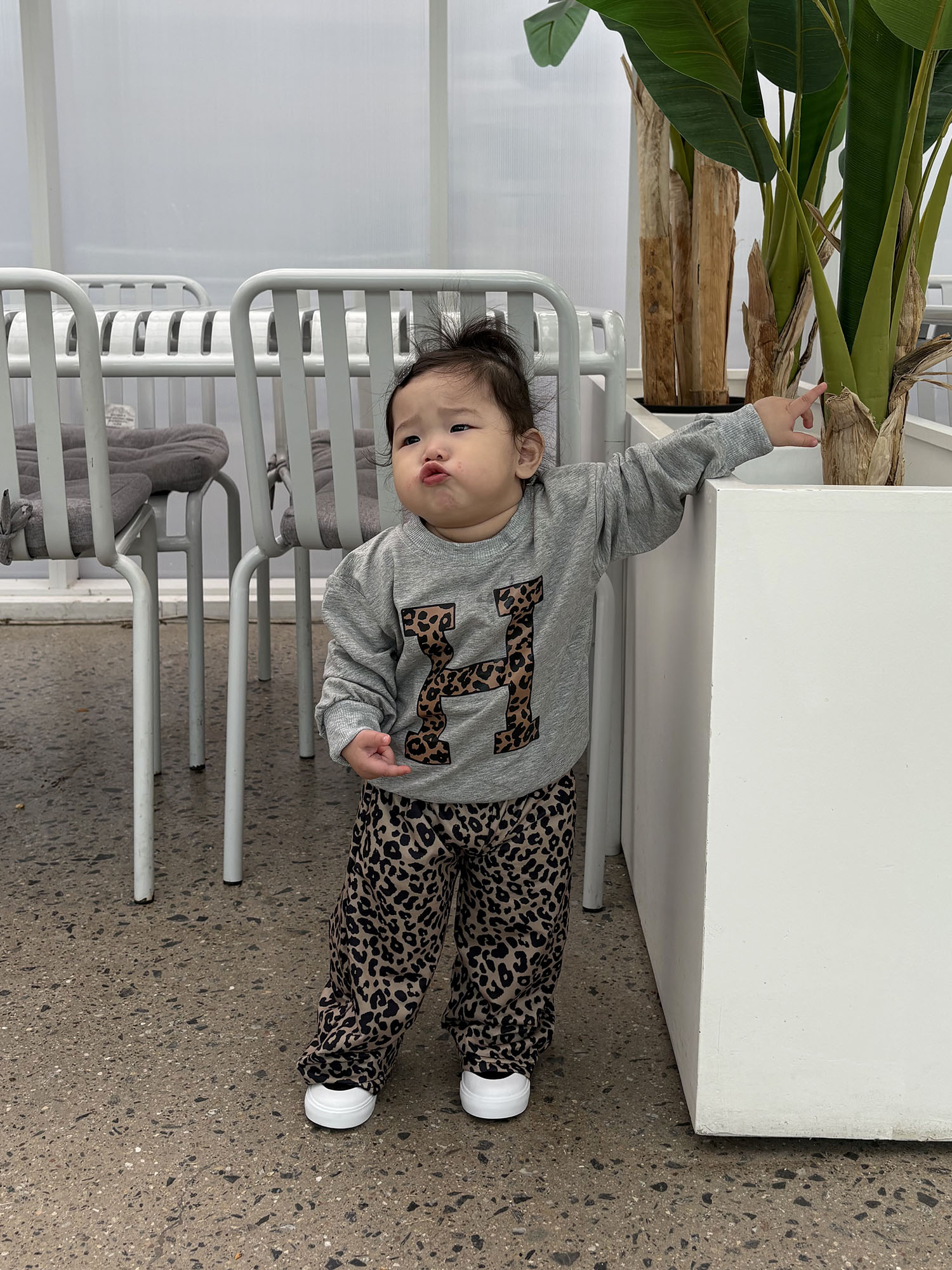 큼직한 레오파드 패턴의 “H” 포인트가 들어간 맨투맨과