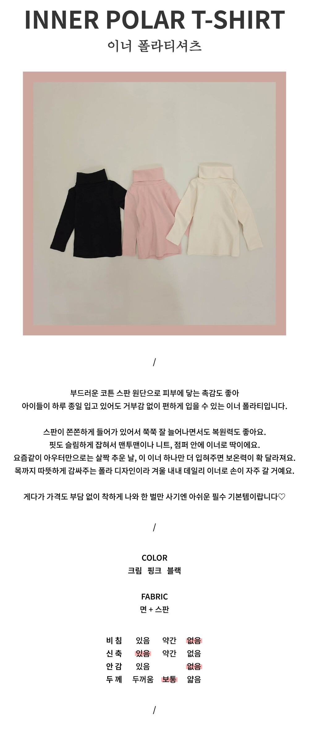아이들이 하루 종일 입고 있어도 거부감 없이 편하게 입을 수 있는 이너 폴라티입니다.