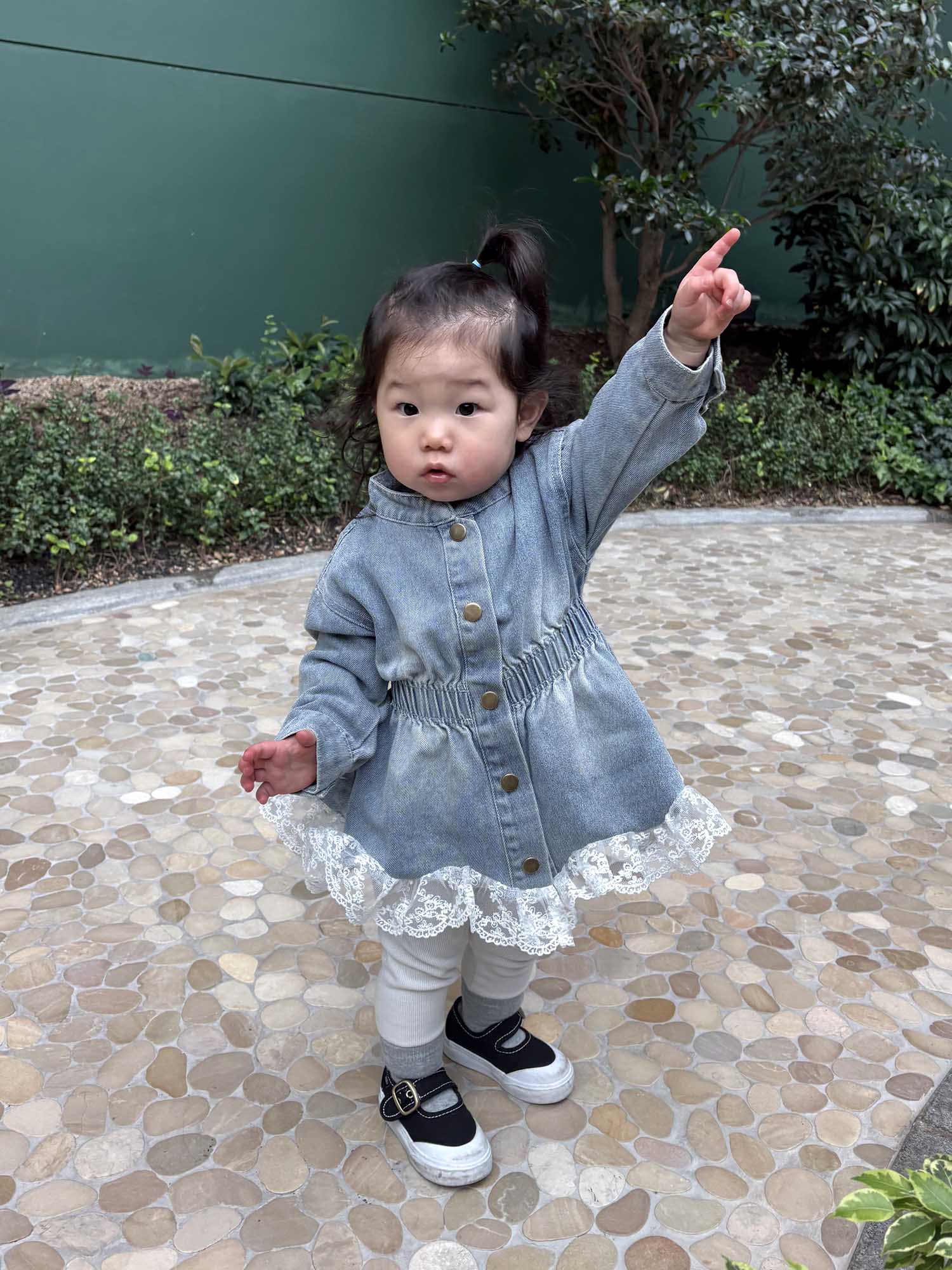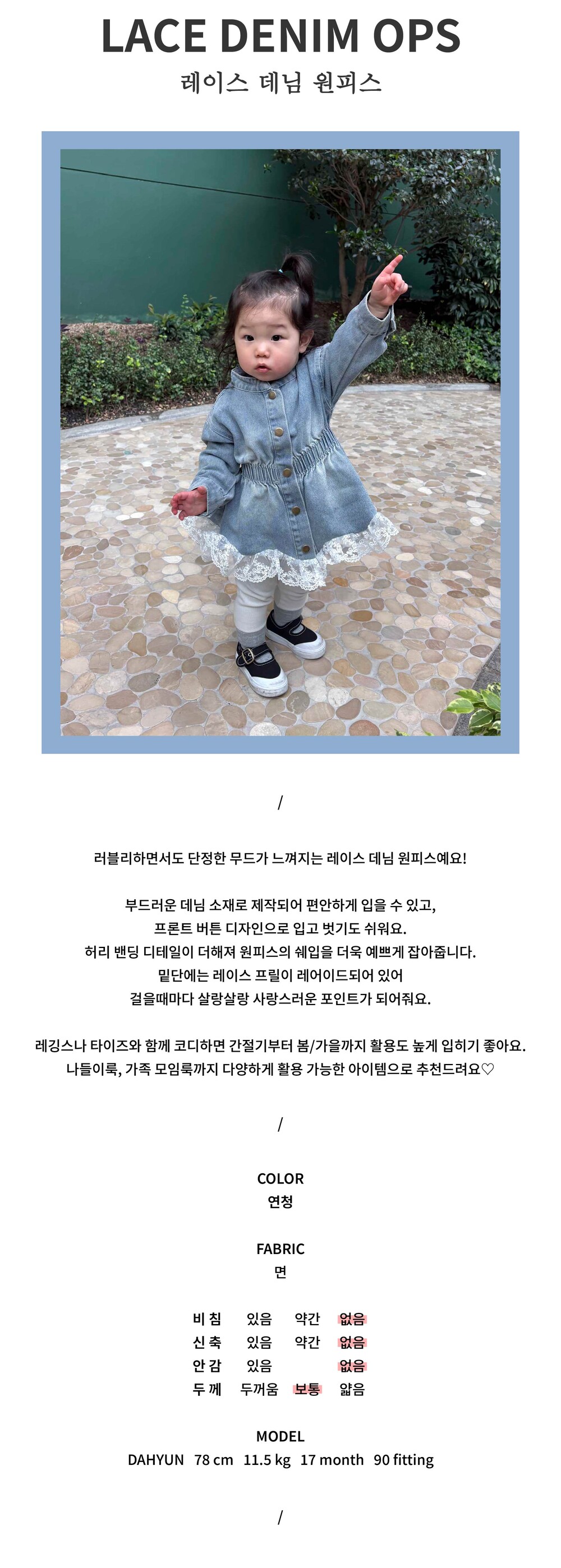 러블리하면서도 단정한 무드가 느껴지는 레이스 데님 원피스예요!