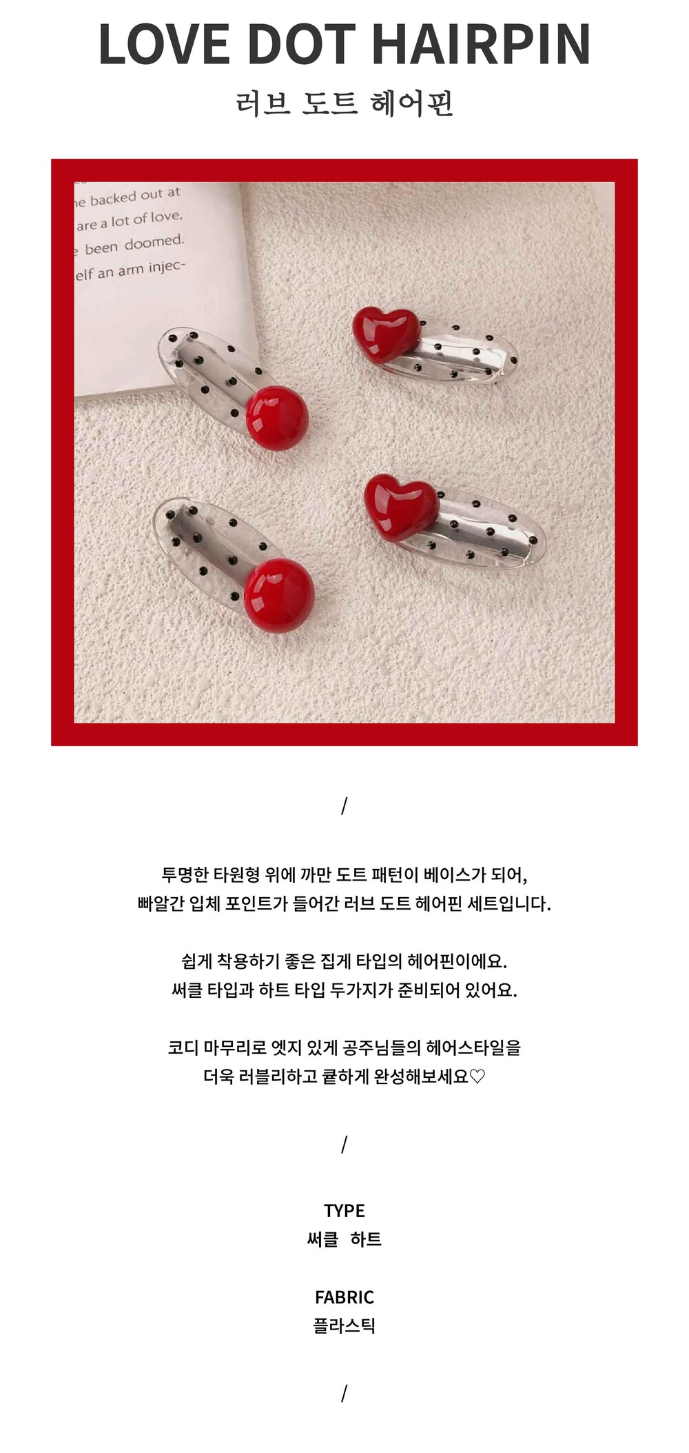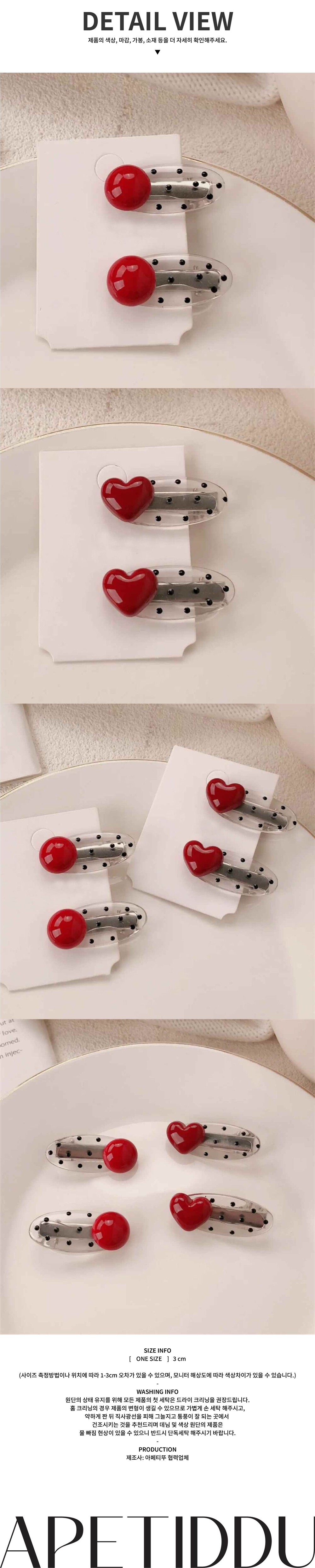 빠알간 입체 포인트가 들어간 러브 도트 헤어핀 세트입니다.