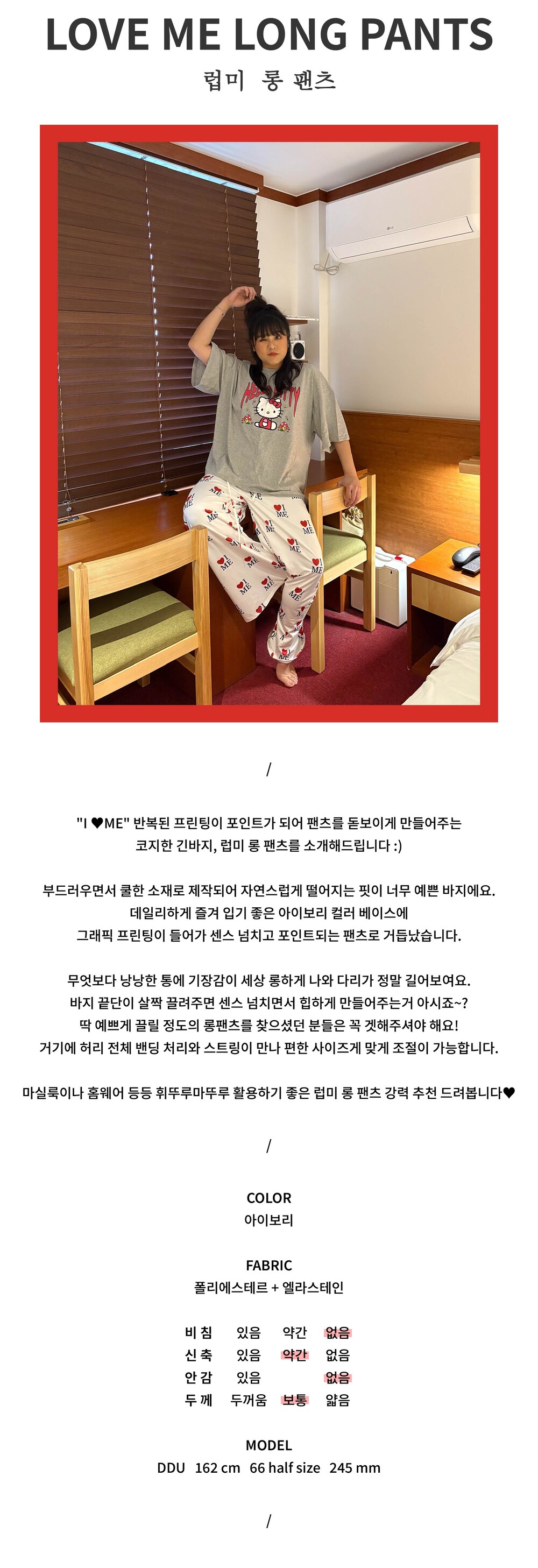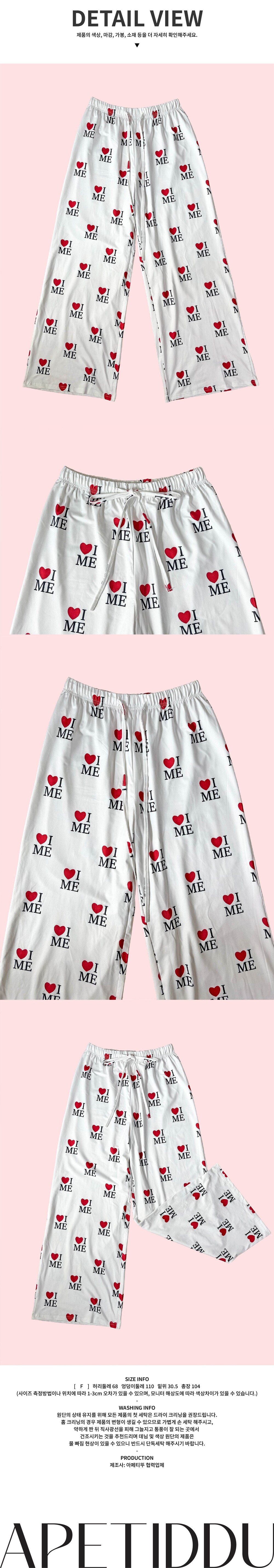 >> 사진을 옆으로 넘겨서 봐주세요♥ - "I ♥ME" 반복된 프린팅이 포인트가 되어 팬츠를 돋보이게 만들어주는 코지한 긴바지, 럽미 롱 팬츠를 소개해드립니다 :)