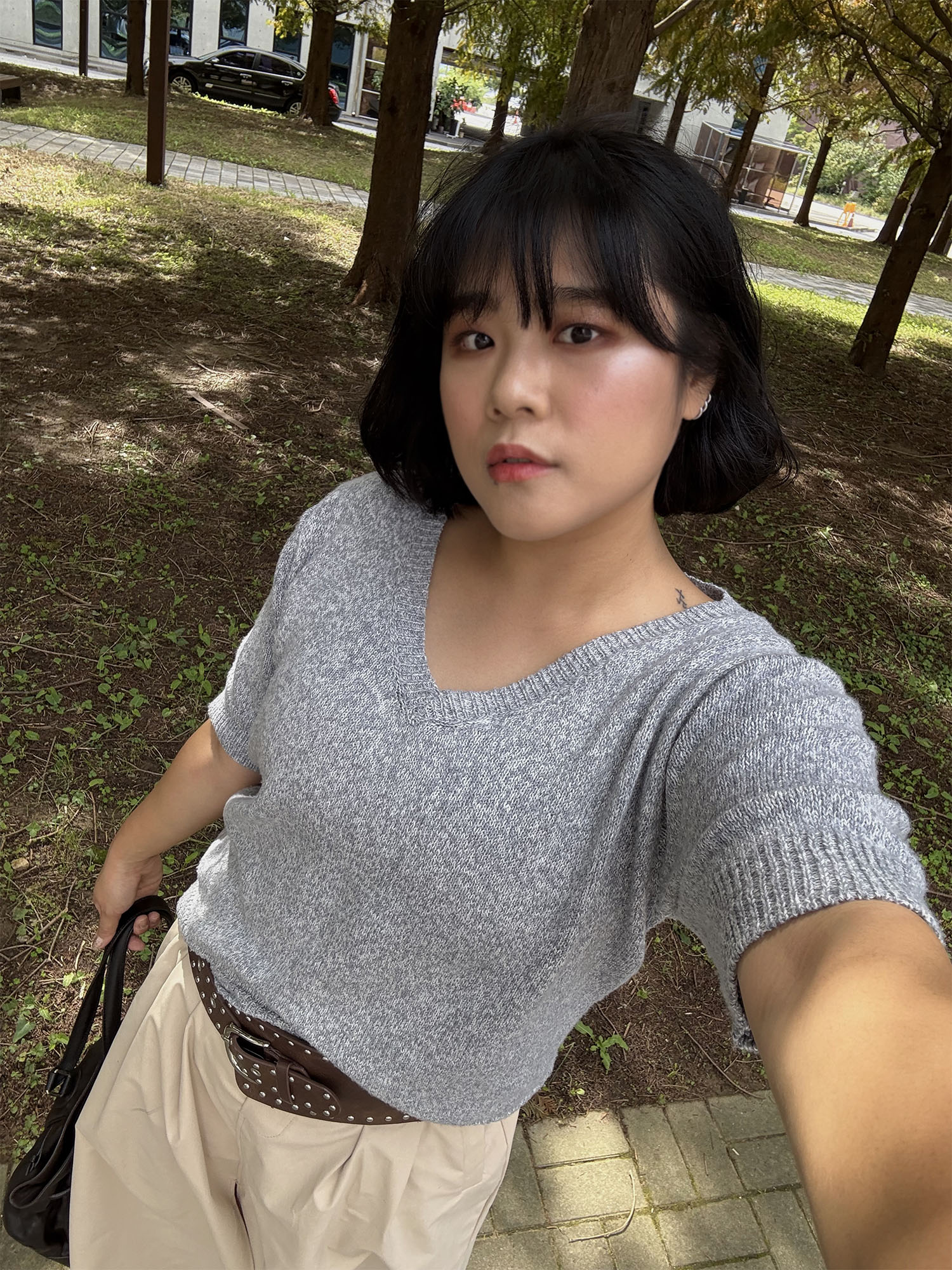팔꿈치 정도 오는 반소매 기장이라 간절기부터 이너로 두루 활용하기 좋아요.