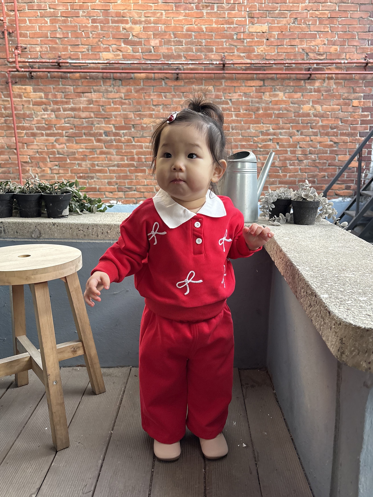 상의에는 귀여운 자수 디테일과 버튼 포인트가 들어가