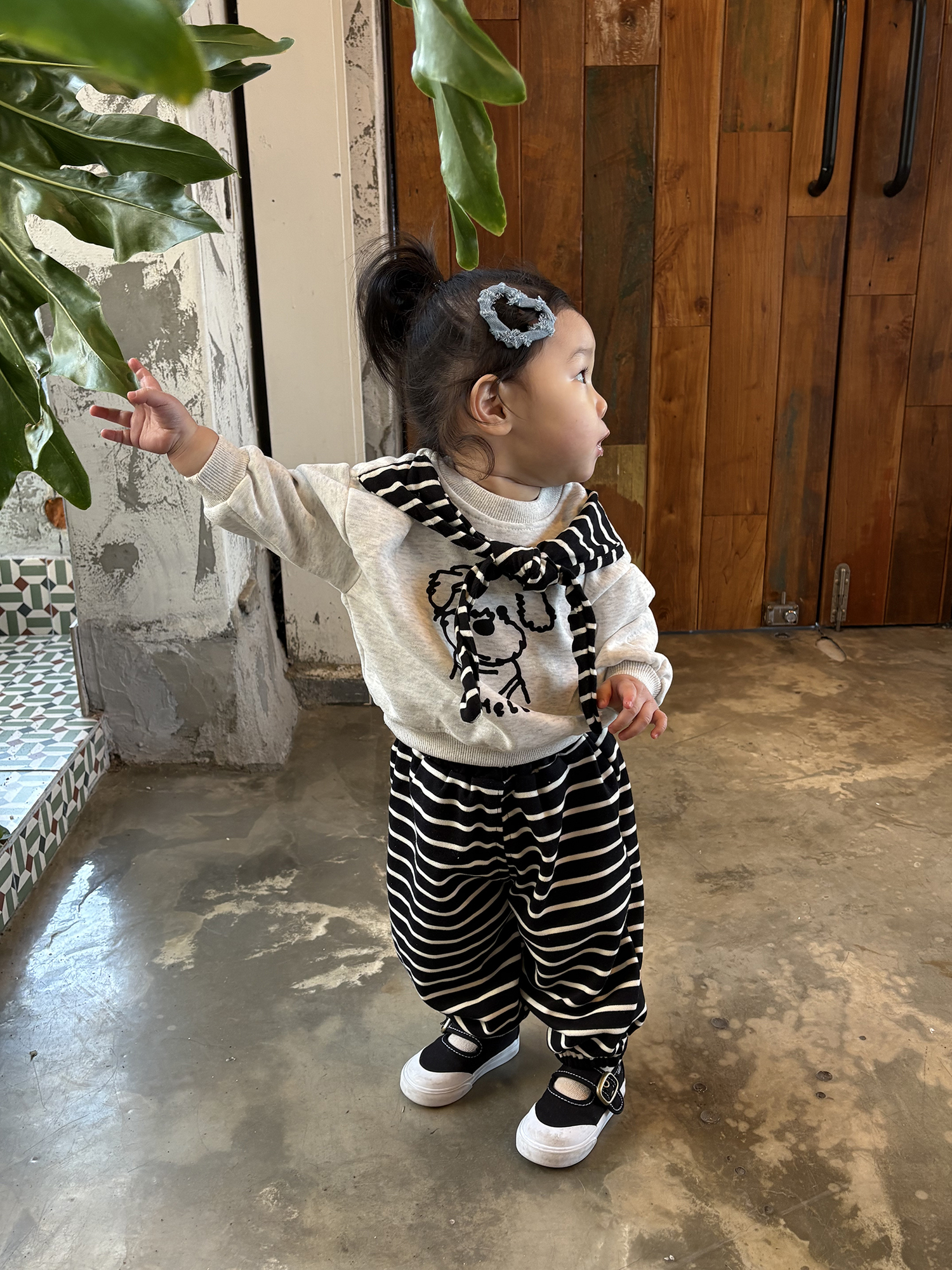 하의는 여유 있게 떨어지는 블랙 스트라이프 팬츠로 활동성이 정말 좋아요.