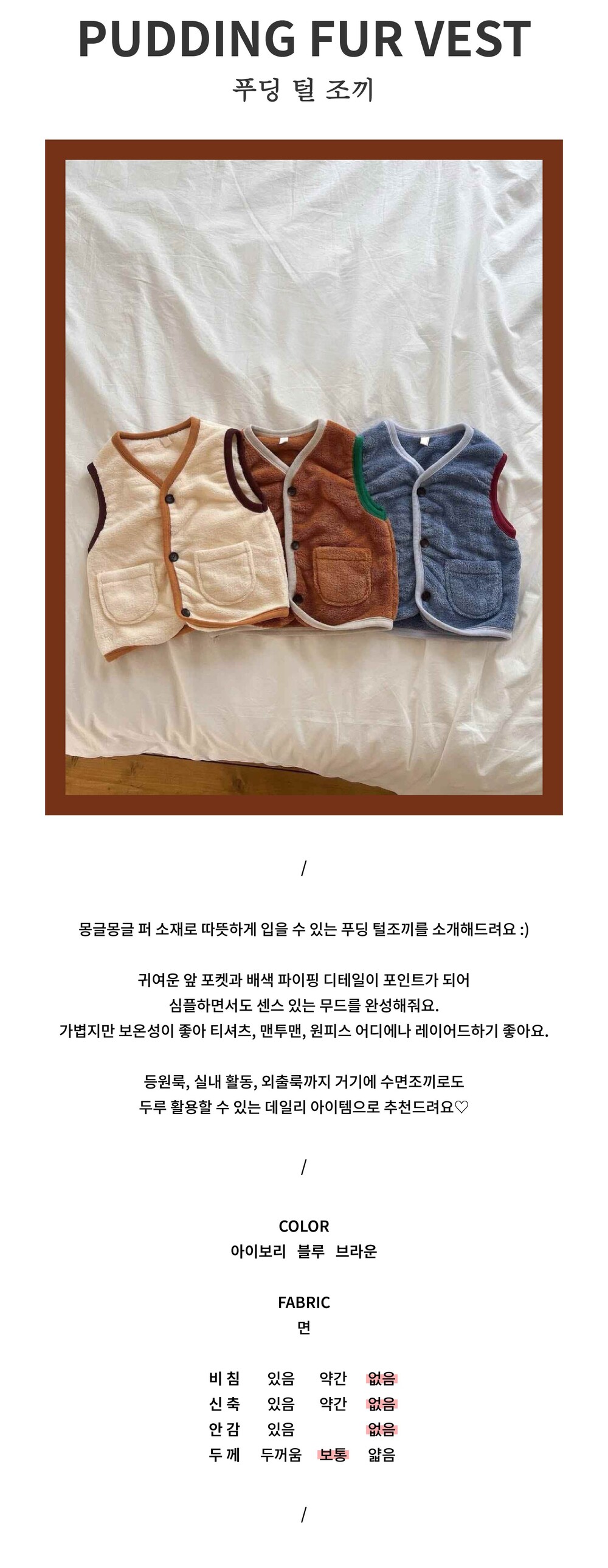 몽글몽글 퍼 소재로 따뜻하게 입을 수 있는 푸딩 털조끼를 소개해드려요 :)