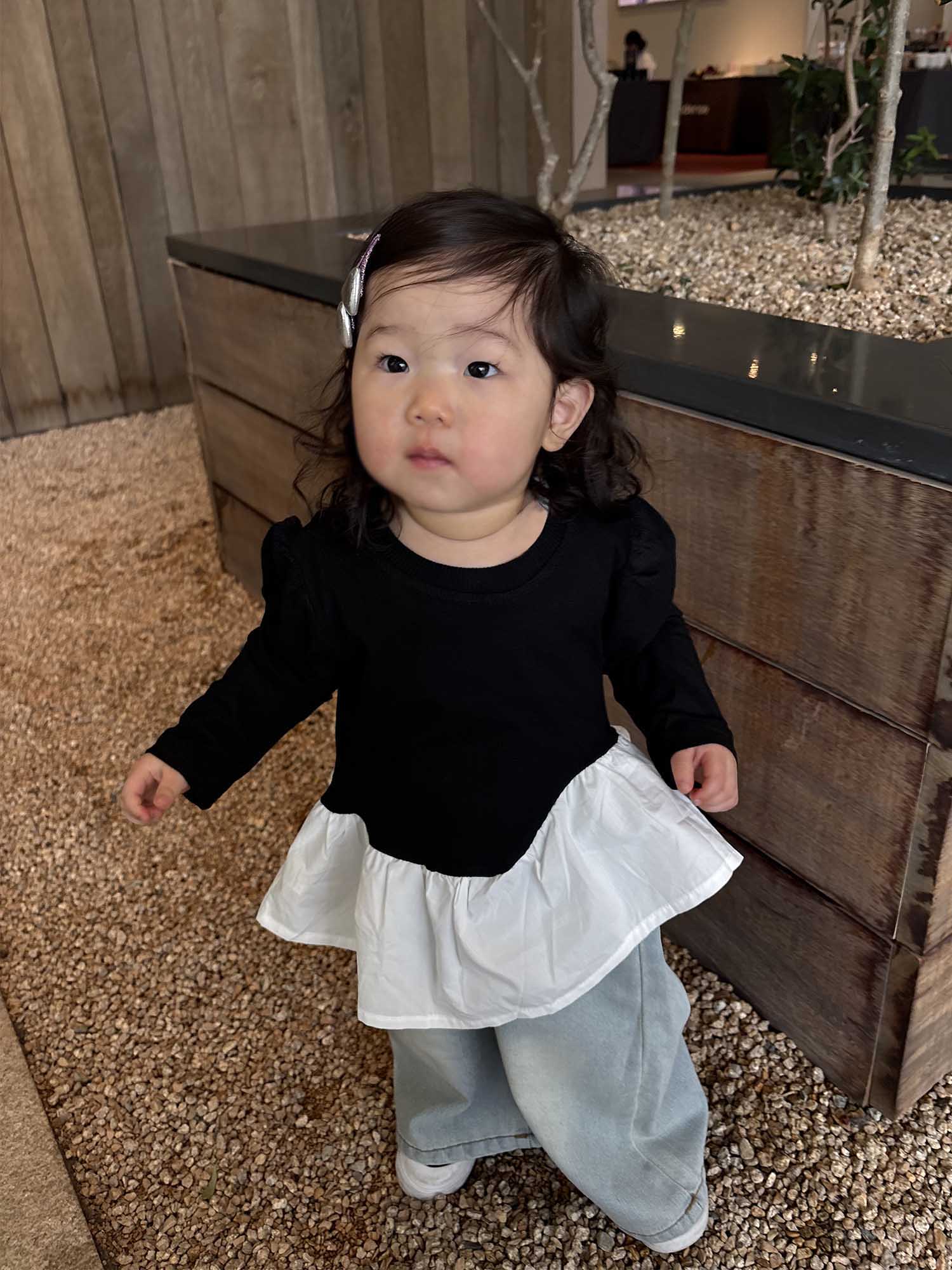 밑단에는 화이트 프릴 디테일이 더해져 마치 블라우스를 레이어드한 듯한 포인트를 살려줘요.