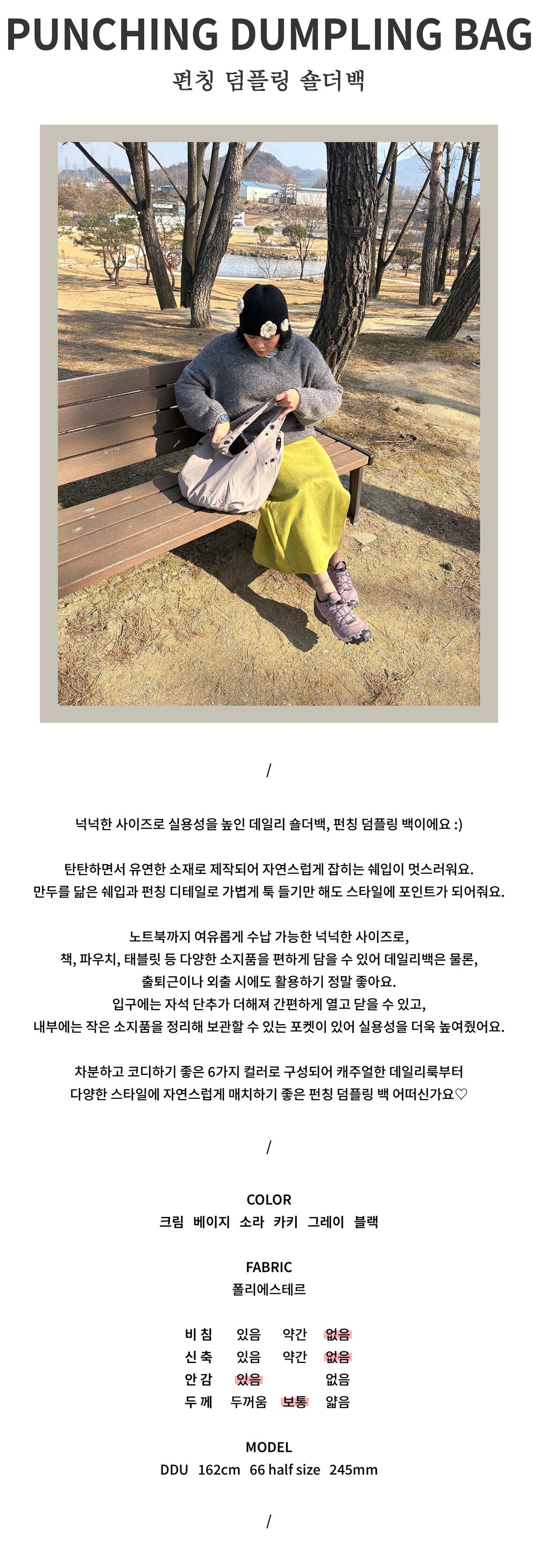 넉넉한 사이즈로 실용성을 높인 데일리 숄더백, 펀칭 덤플링 백이에요 :)