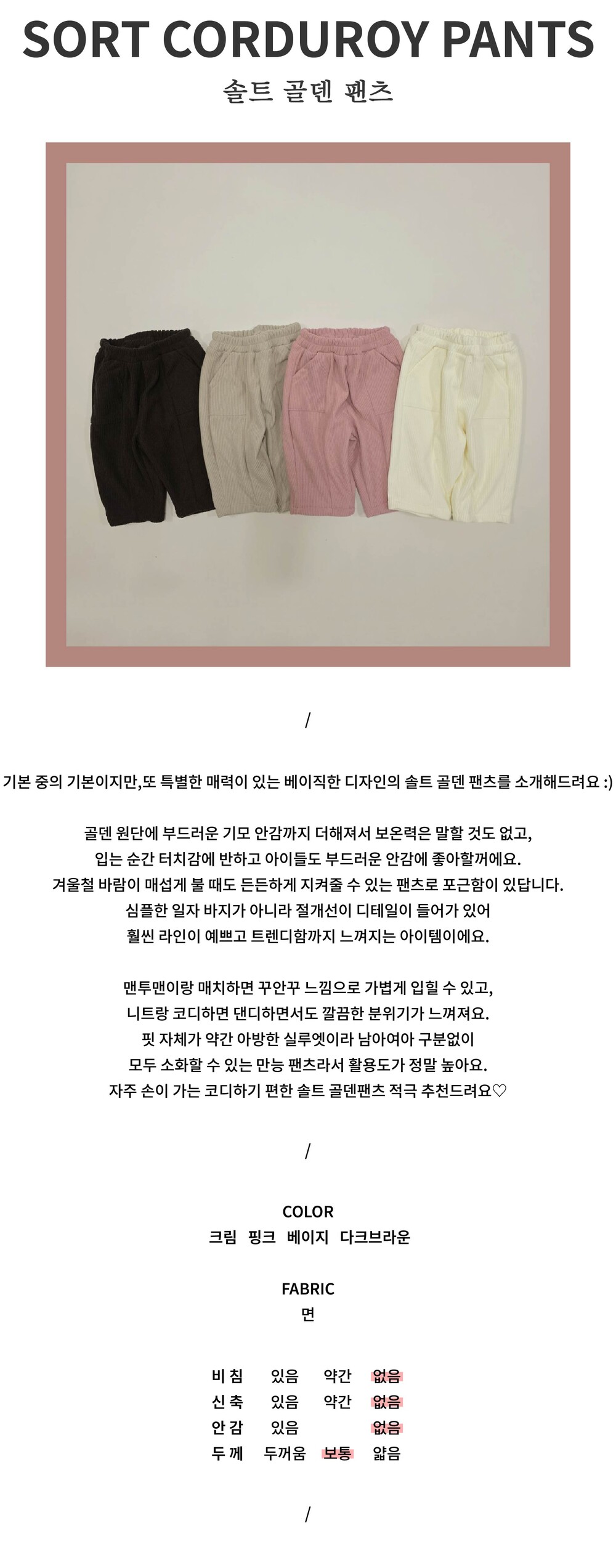 기본 중의 기본이지만,또 특별한 매력이 있는 베이직한 디자인의 솔트 골덴 팬츠를 소개해드려요 :)