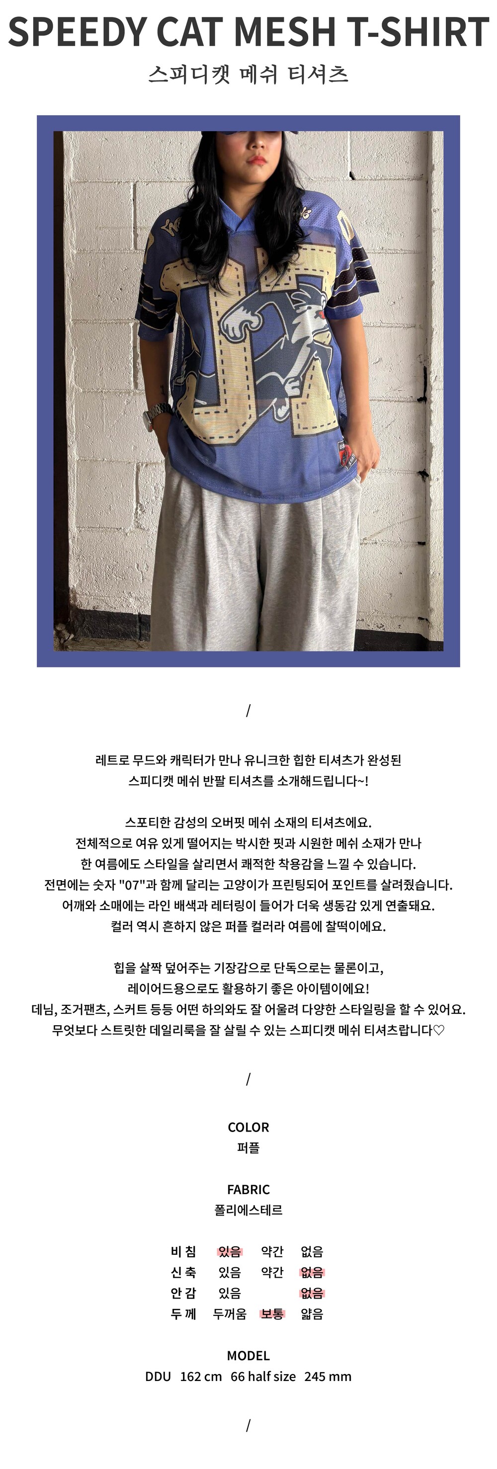 스포티한 감성의 오버핏 메쉬 소재의 티셔츠에요. 전체적으로 여유 있게 떨어지는 박시한 핏과 시원한 메쉬 소재가 만나 한 여름에도 스타일을 살리면서 쾌적한 착용감을 느낄 수 있습니다. 전면에는 숫자 "07"과 함께 달리는 고양이가 프린팅되어 포인트를 살려줬습니다. 어깨와 소매에는 라인 배색과 레터링이 들어가 더욱 생동감 있게 연출돼요. 컬러 역시 흔하지 않은 퍼플 컬러라 여름에 찰떡이에요.