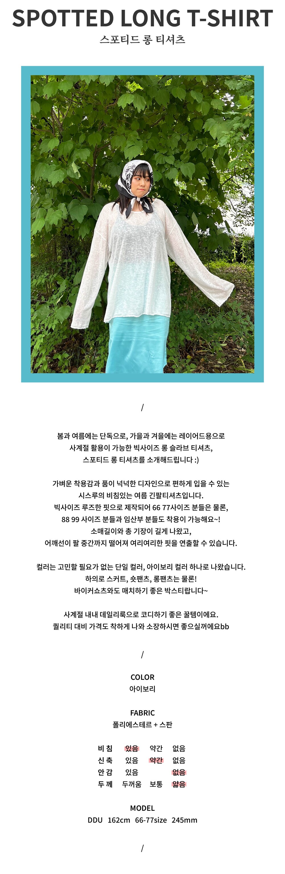 가벼운 착용감과 품이 넉넉한 디자인으로 편하게 입을 수 있는 시스루의 비침있는 여름 긴팔티셔츠입니다. 빅사이즈 루즈한 핏으로 제작되어 66 77사이즈 분들은 물론, 88 99 사이즈 분들과 임산부 분들도 착용이 가능해요~! 소매길이와 총 기장이 길게 나왔고, 어깨선이 팔 중간까지 떨어져 여리여리한 핏을 연출할 수 있습니다.