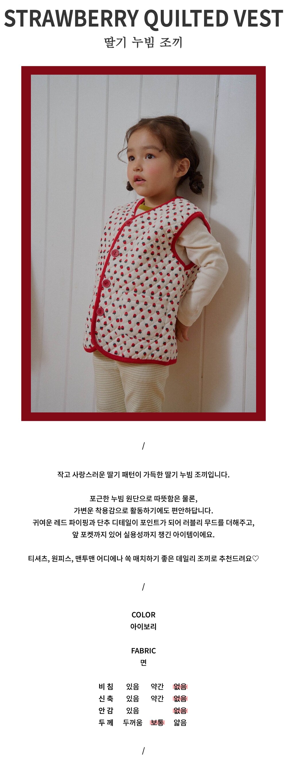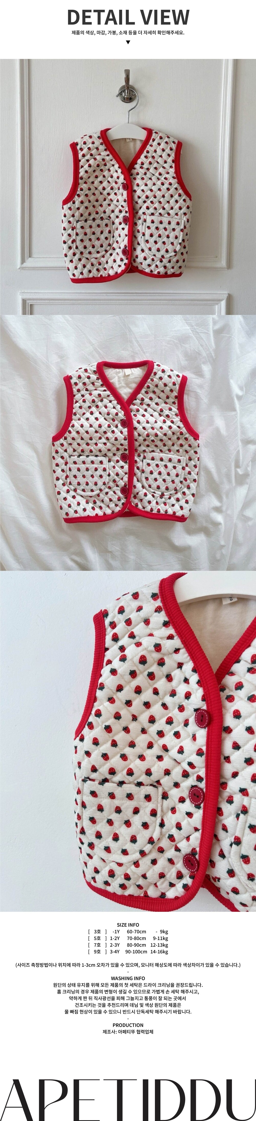 작고 사랑스러운 딸기 패턴이 가득한 딸기 누빔 조끼입니다.