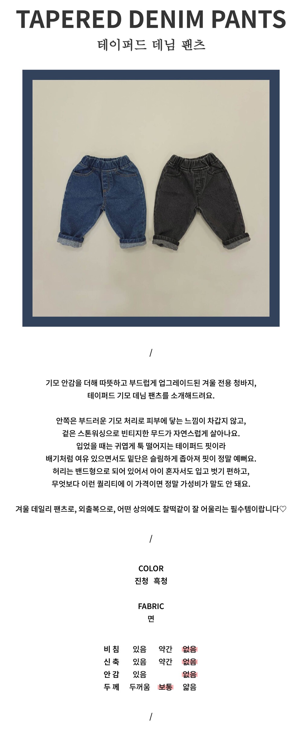테이퍼드 기모 데님 팬츠를 소개해드려요.