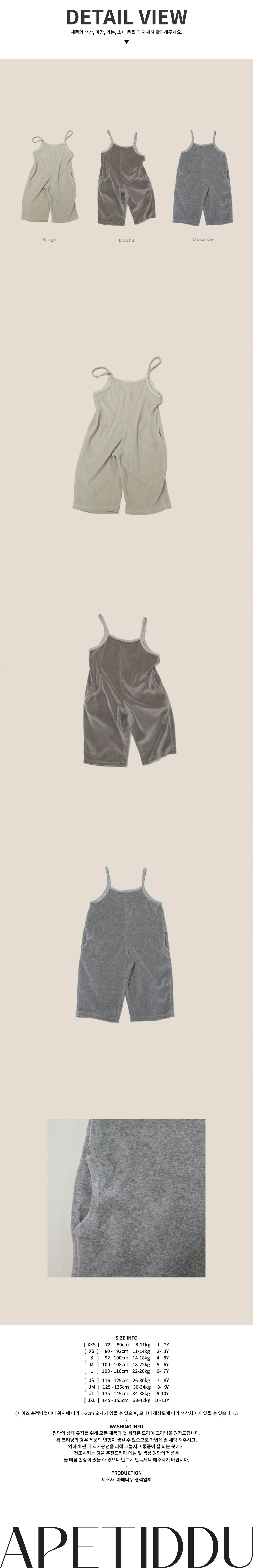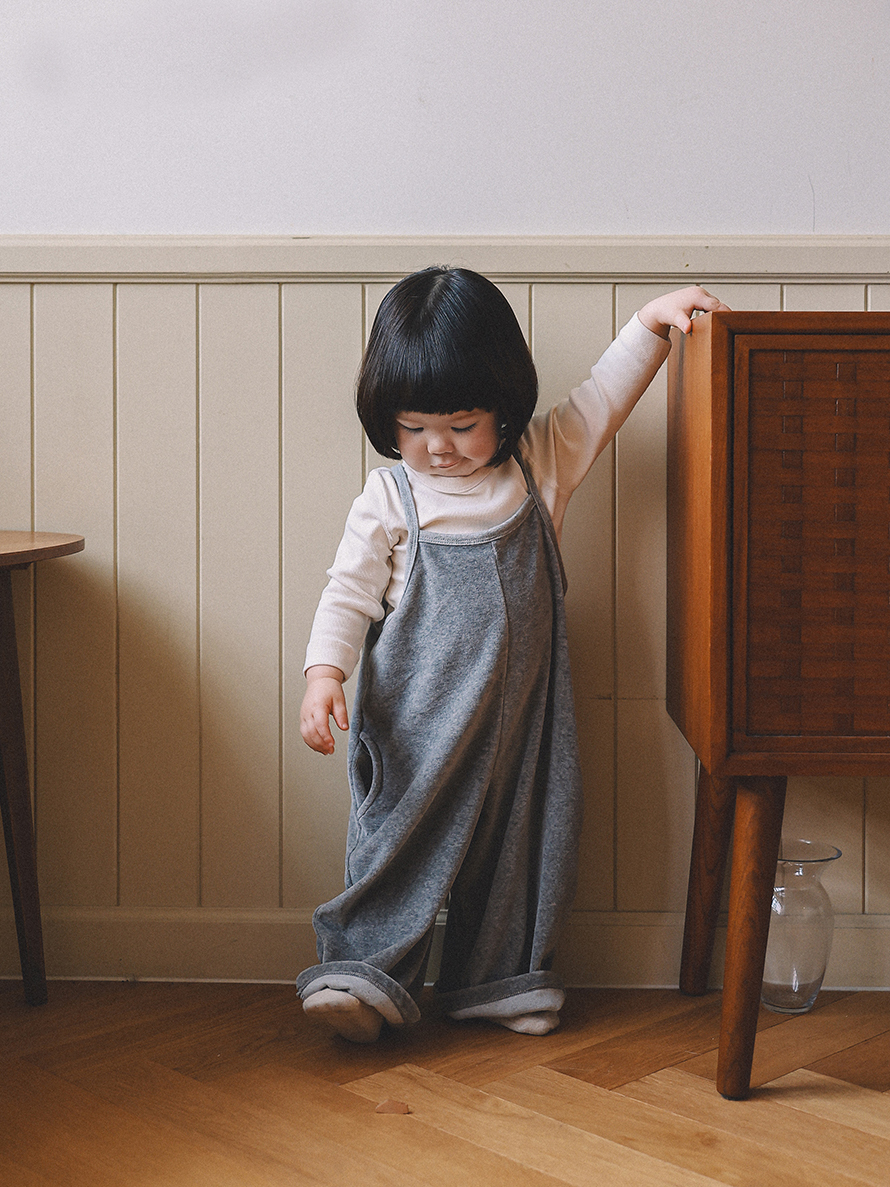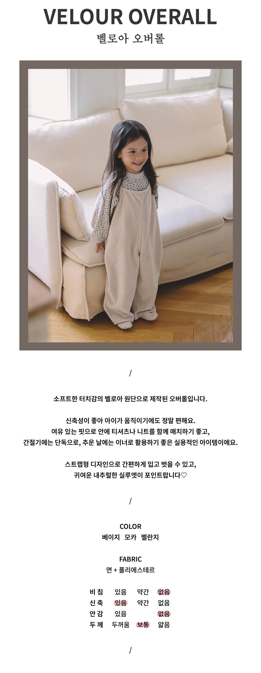 소프트한 터치감의 벨로아 원단으로 제작된 오버롤입니다.