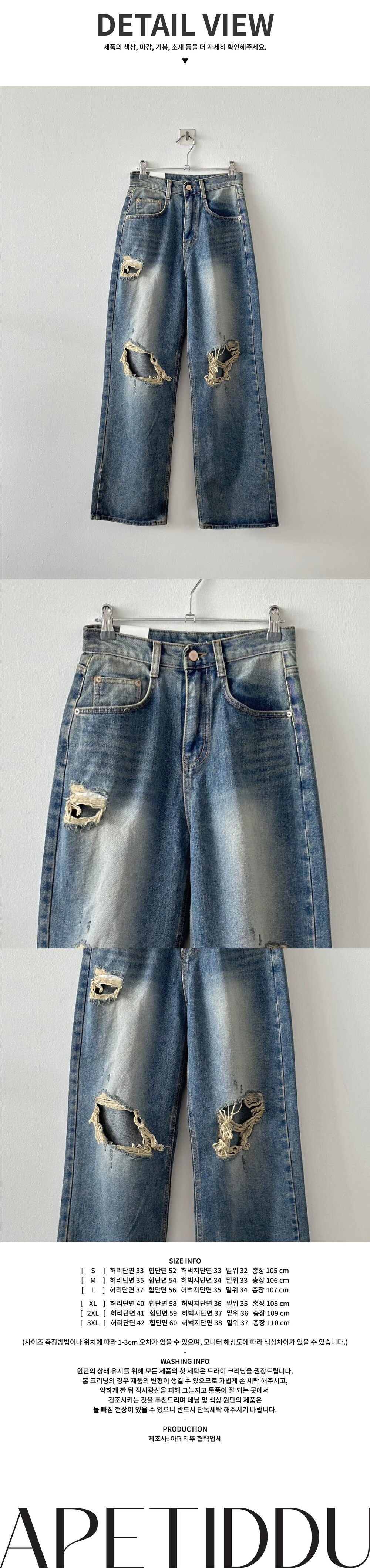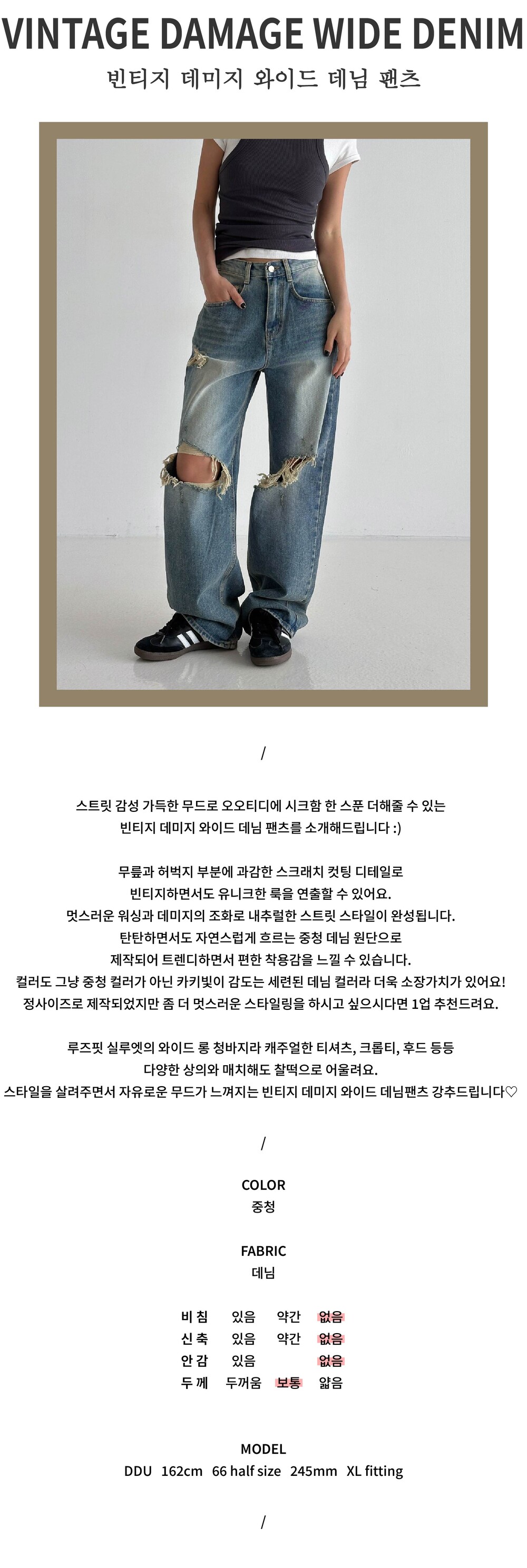스타일을 살려주면서 자유로운 무드가 느껴지는 빈티지 데미지 와이드 데님팬츠 강추드립니다♡